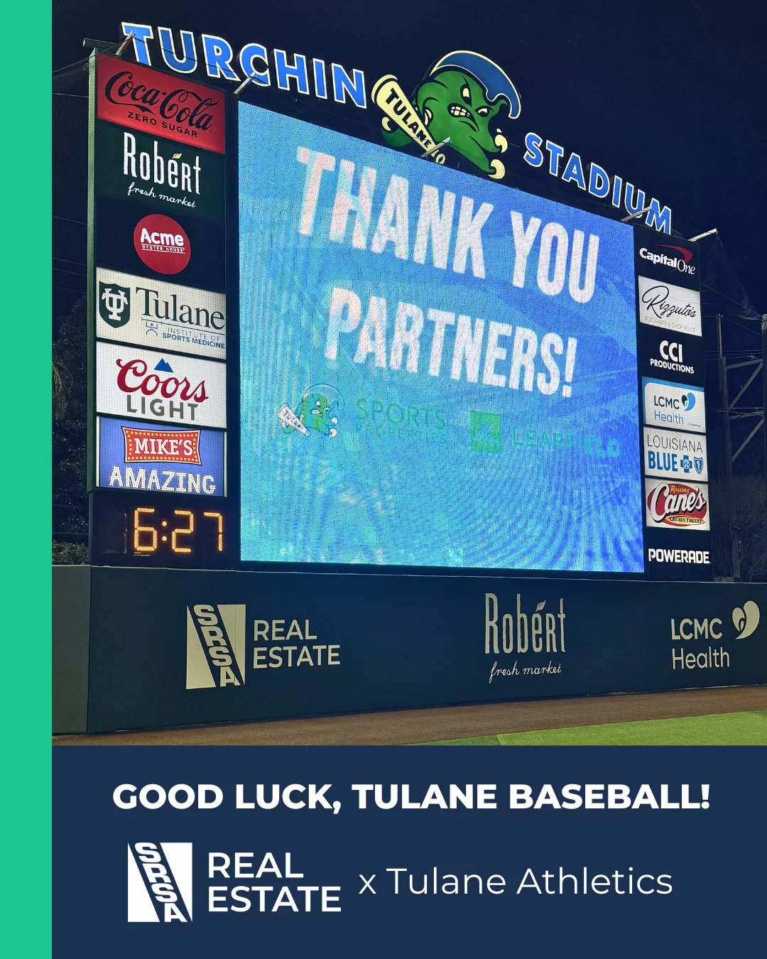 With the first home game of the baseball season this weekend, we recently visited Tulane Baseball's stadium and got to see our logo right under the scoreboard.